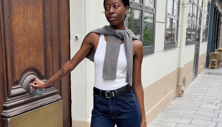 This outfit is inspired by the Parisian look above with the sweater tied around the shoulders for chillier nights.