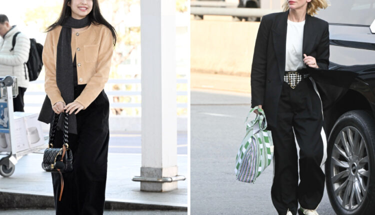 Style Notes: We can’t all travel with a Chanel 2.55 bag like Jennie Kim. However, the rest of her outfit is a practical choice for any travel plans. She opted for a barrel-leg pant silhouette, which is a more fashion-forward choice, paired with a classic, cozy cardigan and a scarf looped around her neck that will then handily double up as a neck pillow mid-flight.