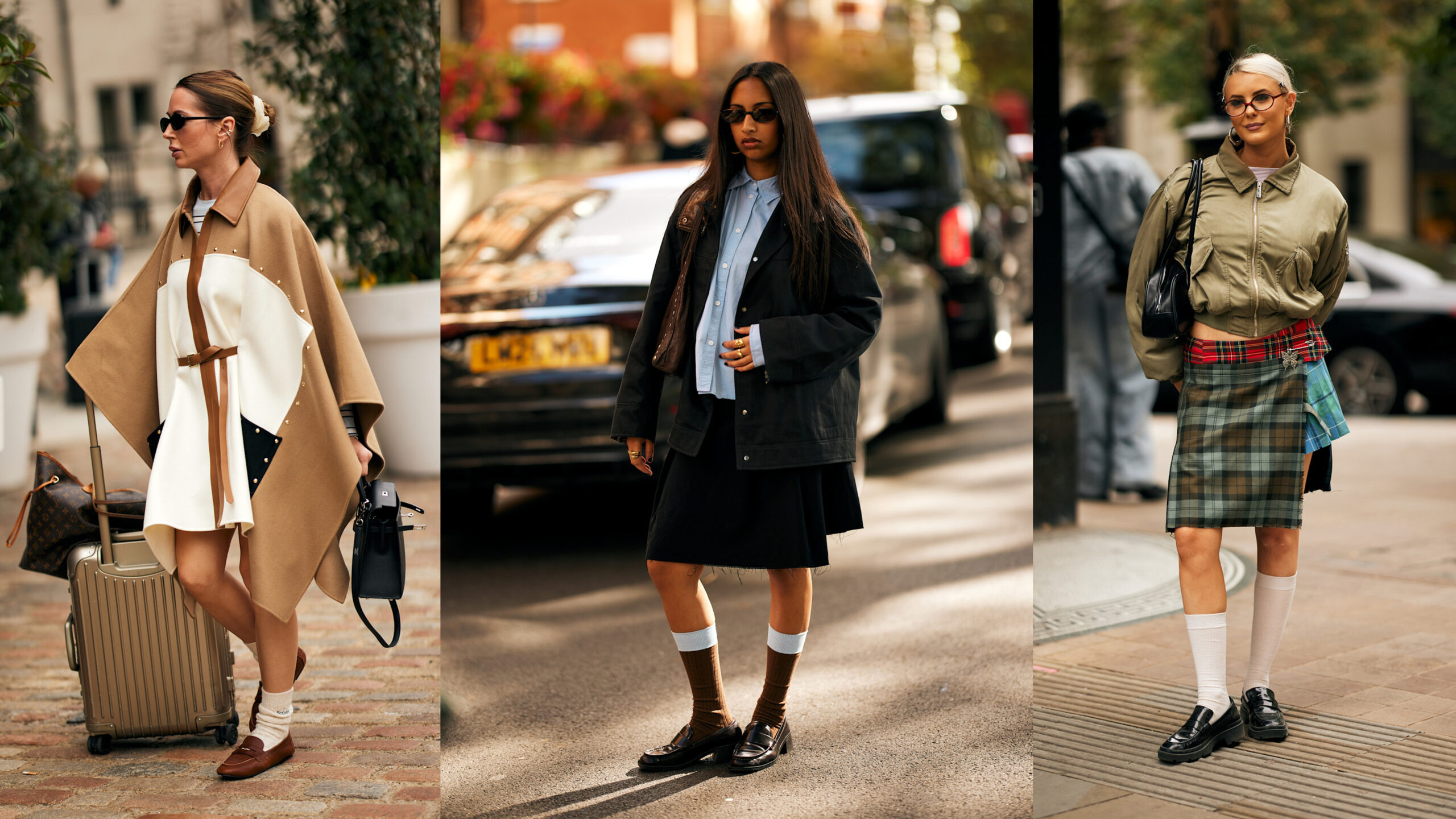 With fall officially here, it’s no surprise to see women’s loafers everywhere, once again proving themselves as the ultimate fall shoes. From expensive-looking suede loafers to patent-leather styles, chic Londoners displayed their unique tastes. But one common element tied these looks together: socks. Penny loafers paired with scrunched-up socks fit the playful edge of short dresses, while classic loafers with tall socks created a polished, preppy vibe—especially when styled with plaid midi skirts or long capes.