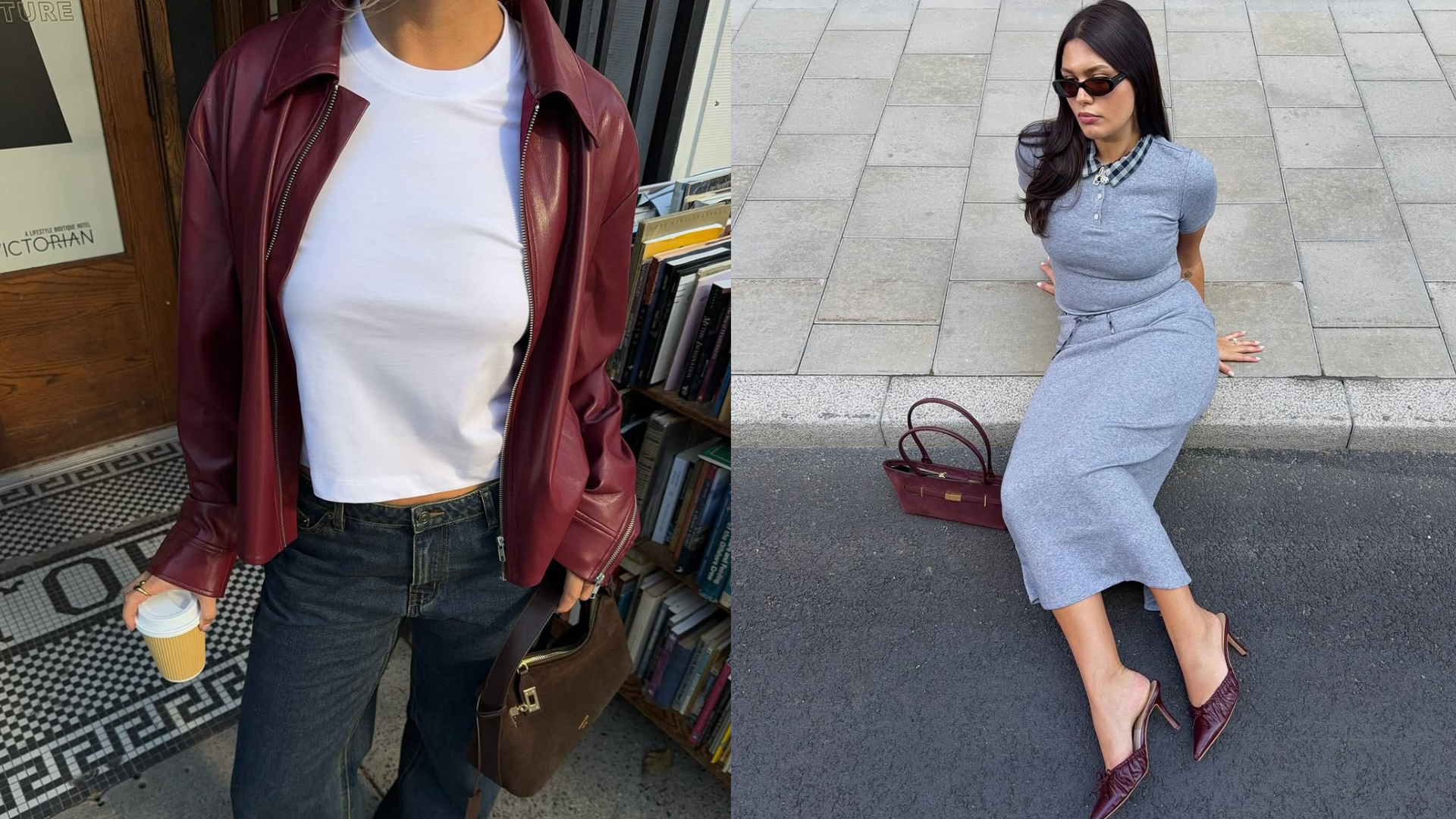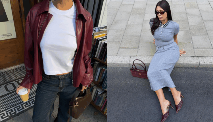 On the dress side of things, burgundy plays the ultimate supporting role. A simple slip dress takes on new depth when styled with croc-embossed burgundy heels, and a sweaterdress feels less predictable with burgundy knee-high boots instead of classic black. Even minimalist midi dresses, the kind you’d normally wear with neutral sandals, look instantly more intentional with burgundy shoes. The richness of the shade complements both crisp white and deep jewel tones, making it a go-to for endless outfit combinations.