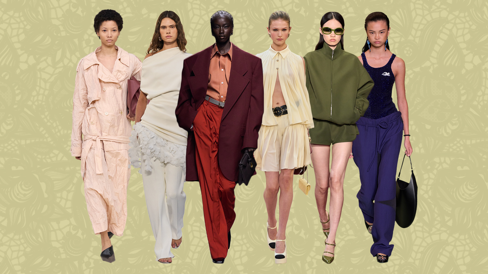 Collage of models wearing martini olive green on the spring/summer 2025 runways.