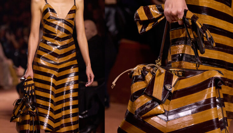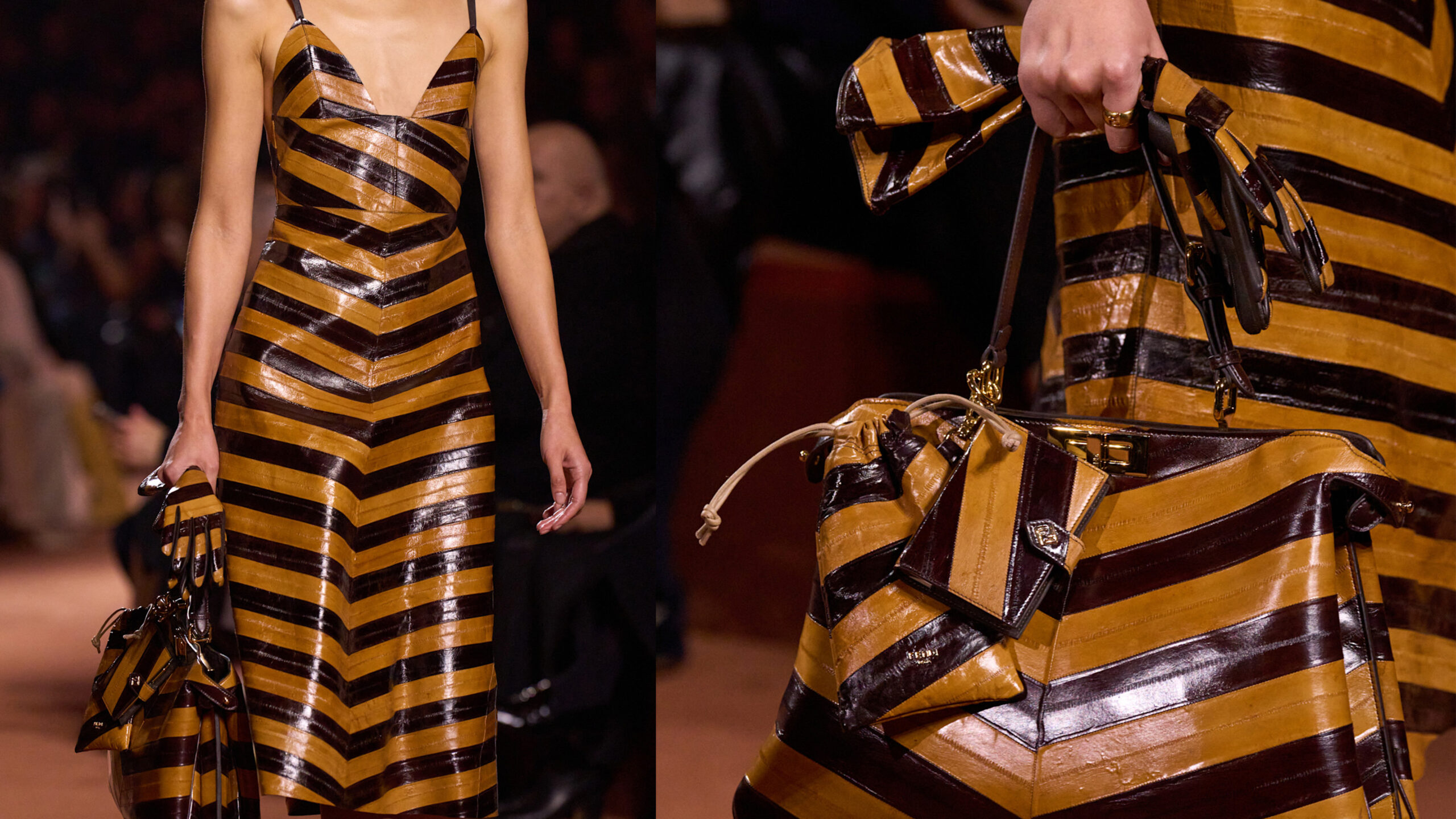 I first took notice of eel print when Fendi included a bevy of styles made of the leather in its F/W 2025 show back in February, including a brown-and-black chevron-pattern dress and skirt that had a matching pair of boots and bag. At the re-see, I probably took 100 photos of the pieces, obsessed with how unique the print was. Since then, I’ve noticed it used at Khaite, Ferragamo, and The Row, as well as more affordable brands like J.Crew, Reformation, and Massimo Dutti, using a mix of faux and genuine leather that’s been embossed to look like eel.