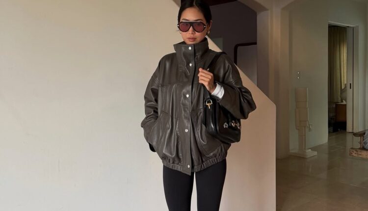 Get the look: Oversize leather coat + Button-down shirt + Loose light black jeans + Sneakers