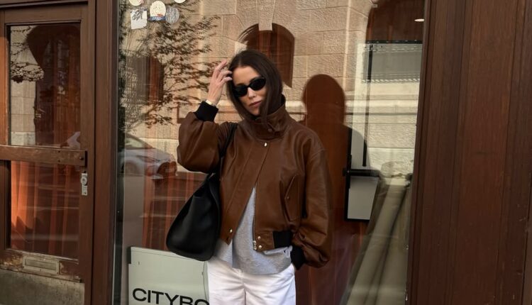 Influencer Nnenna Echem in a brown jacket, black wide-leg pants, and white sneakers.