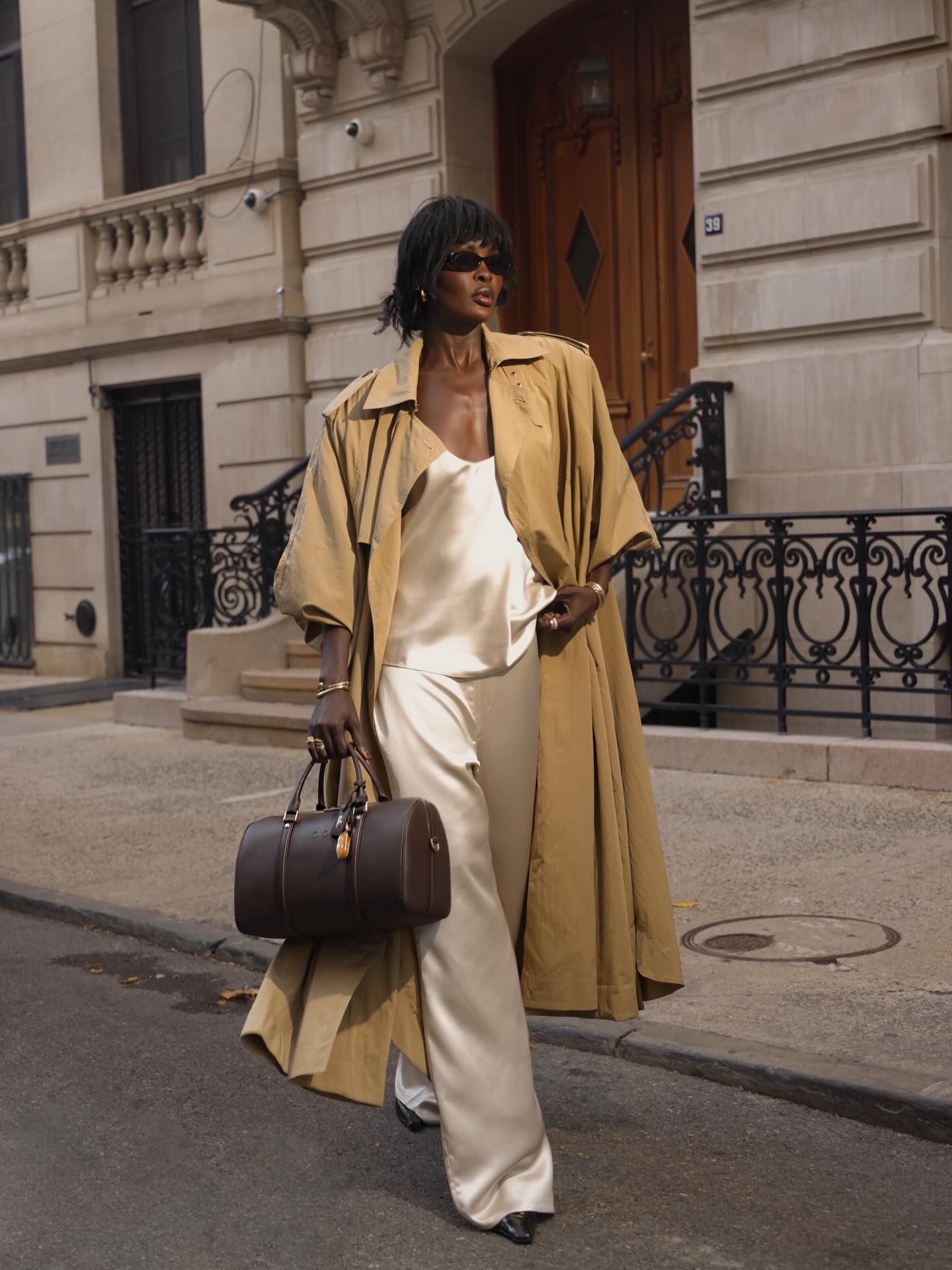 Amy couldn’t have nailed this look better. Styled with a trench coat and duffel bag, this feels like an absolutely cinematic moment.