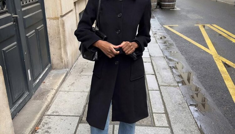 Get the look: Tailored long coat + Simple sweater + Jeans + Heels